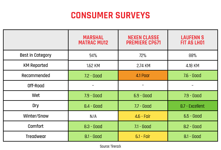 Consumer Surveys For Marshal Matrac MU12 vs Nexen CP672 vs Laufenn S FIT AS LH01
