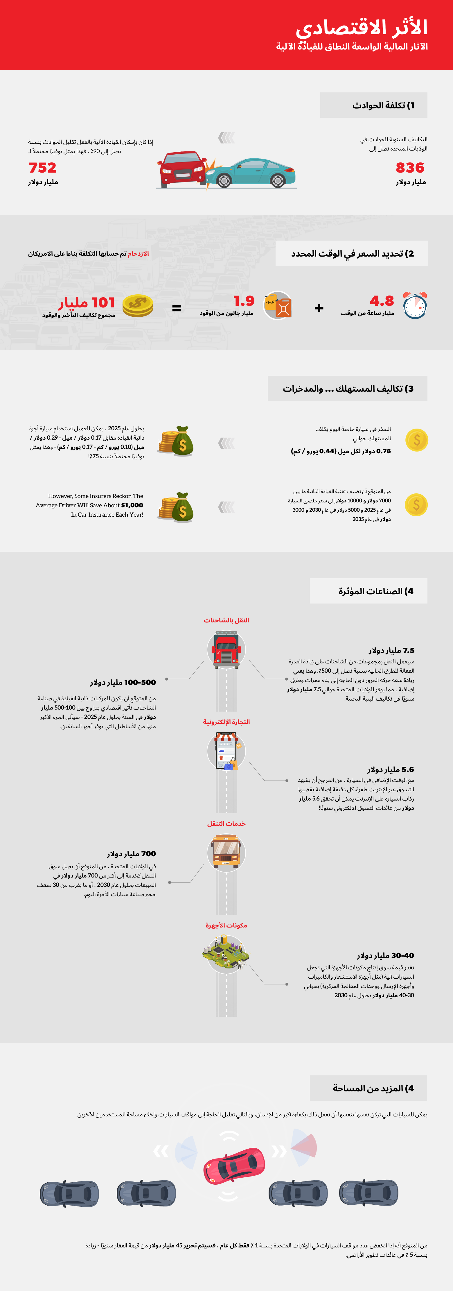 قد لا تدرك ذلك ، لكن التكاليف السنوية للحوادث في الإمارات العربية المتحدة تبلغ قيمتها عدة مليارات من الدولارات، عندما ننظر إليها من منظور عالمي ، فمن الآمن أن نستنتج أن حوادث السيارات تتسبب في خسائر تقدر بمليارات الدولارات. كيف؟ يأخذ معظم الناس في الاعتبار تكاليف إصلاح السيارة فقط ويفشلون في النظر في فواتير المستشفى أو خسارة الأرباح بسبب الإصابات أو مدفوعات التأمين، ستعمل القيادة الآلية على تقليل الحوادث إلى حد كبير وتساعد في توفير تريليونات الدولارات في العالم كل عام.