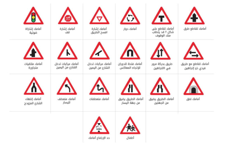 - علامات التحذير: هذه علامات على شكل الماس ذات خلفية صفراء ورموز سوداء تحذر السائقين من المخاطر المحتملة.