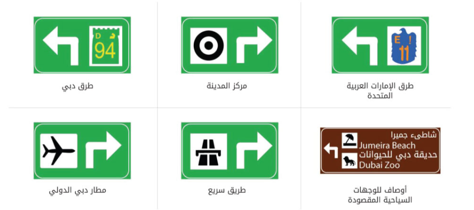 تم تصميم علامات المرور في دولة الإمارات لتكون سهلة الفهم، باستخدام اللغتين الإنجليزية والعربية بالإضافة إلى الرموز الدولية القياسية. يساعد تشفير الألوان في نقل المعاني: