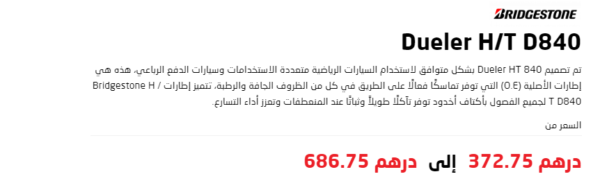 تتناول هذه المقالة ما يشمله السعر الموضح مقابل كل إطار على موقع بيت ستوب آرابيا. إذا قمت بالنقر فوق Bridgestone DUELER H / T D840 ، فسيعرض الموقع السعر هكذا: