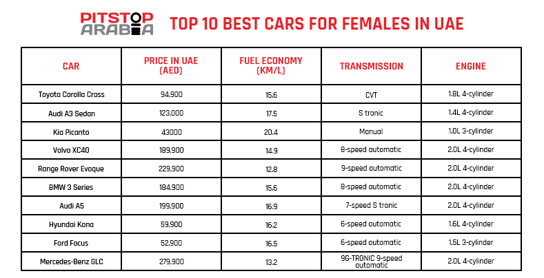 The best cars for women in the UAE are those that are safe, fuel-efficient, and stylish. Some of the Best Cars For Females include the Toyota Corolla Cross, Audi A3 Sedan, Kia Picanto, Volvo XC40, Range Rover Evoque, BMW 3 Series, Audi A5, and Mercedes-Benz GLC. These cars offer a variety of features that appeal to women, such as advanced safety features, comfortable interiors, and intuitive technology.